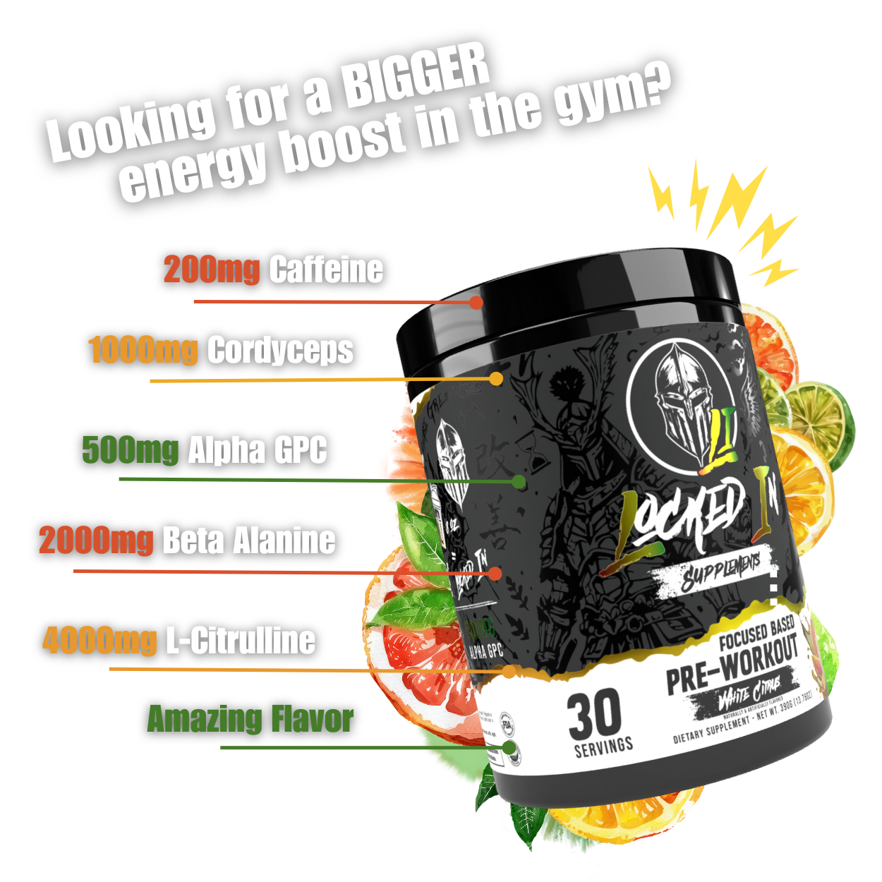 Nope. Locked In uses 200mg of caffeine paired with Cordyceps for smoother, cleaner energy. You’ll feel dialed in—without the crash or anxiety that comes with stim-heavy formulas. (It will give you that tingling sensation from beta alanine, which is normal).